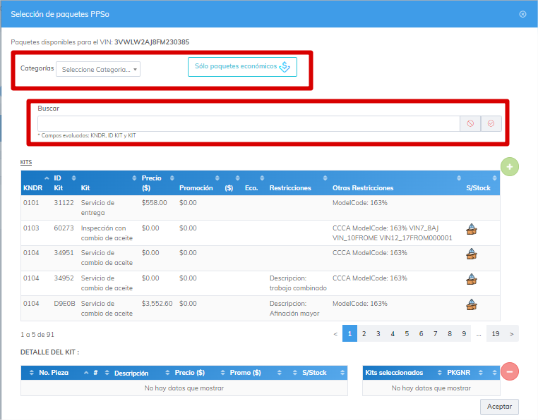 Al oprimir el botón de Buscar nos abre los paquetes asignados a este VIN.