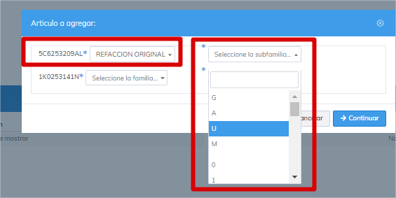 Como las refacciones no existen, toma los registros del catálogo de refacciones de planta y los guarda en el catálogo de refacciones de la agencia, nos solicitará la Familia y Subfamilia.