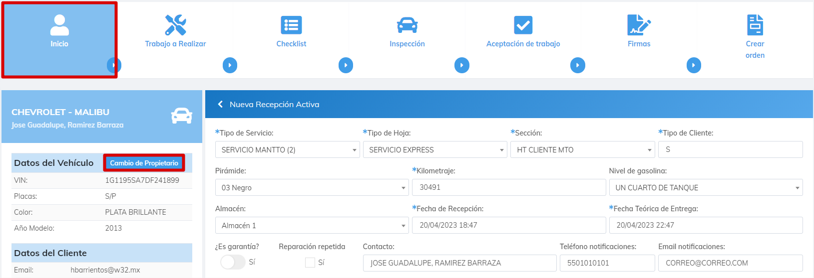 Al continuar, se realiza el cambio de propietario de vehículo y el cliente en la recepción.