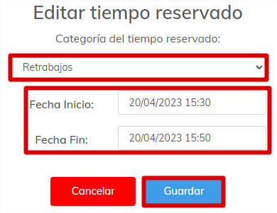 Se muestra la ventana en donde indicaremos el motivo del tiempo muerto, además de poder definir el rango de tiempo exacto. Damos clic al botón Reservar para asignar el tiempo muerto.