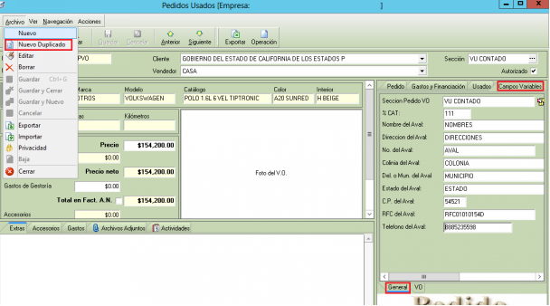 Con la nueva versión, al utilizar la opción de “Nuevo Duplicado” dentro de un pedido V.N o pedido Usado, los valores de los campos variables de la pestaña “General” se cargarán en el nuevo pedido VN o pedido Usado, de tal forma que esto puede ayudar a reducir la captura de valores de campos dentro de una venta que regularmente puede ser a un mismo cliente.