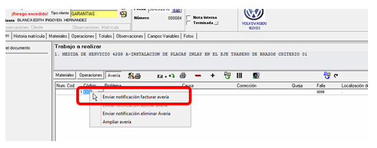Después de dicho proceso se envía a SAGA la notificación de facturar avería y se concluye con la orden de garantía de forma normal. Se puede Facturar la orden en ese momento o bien, esperar nota de crédito de VW.
