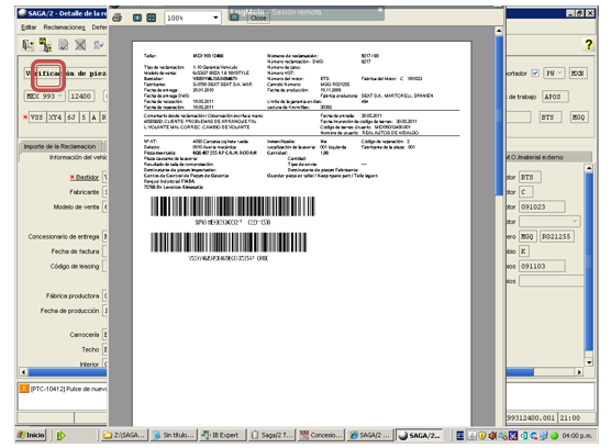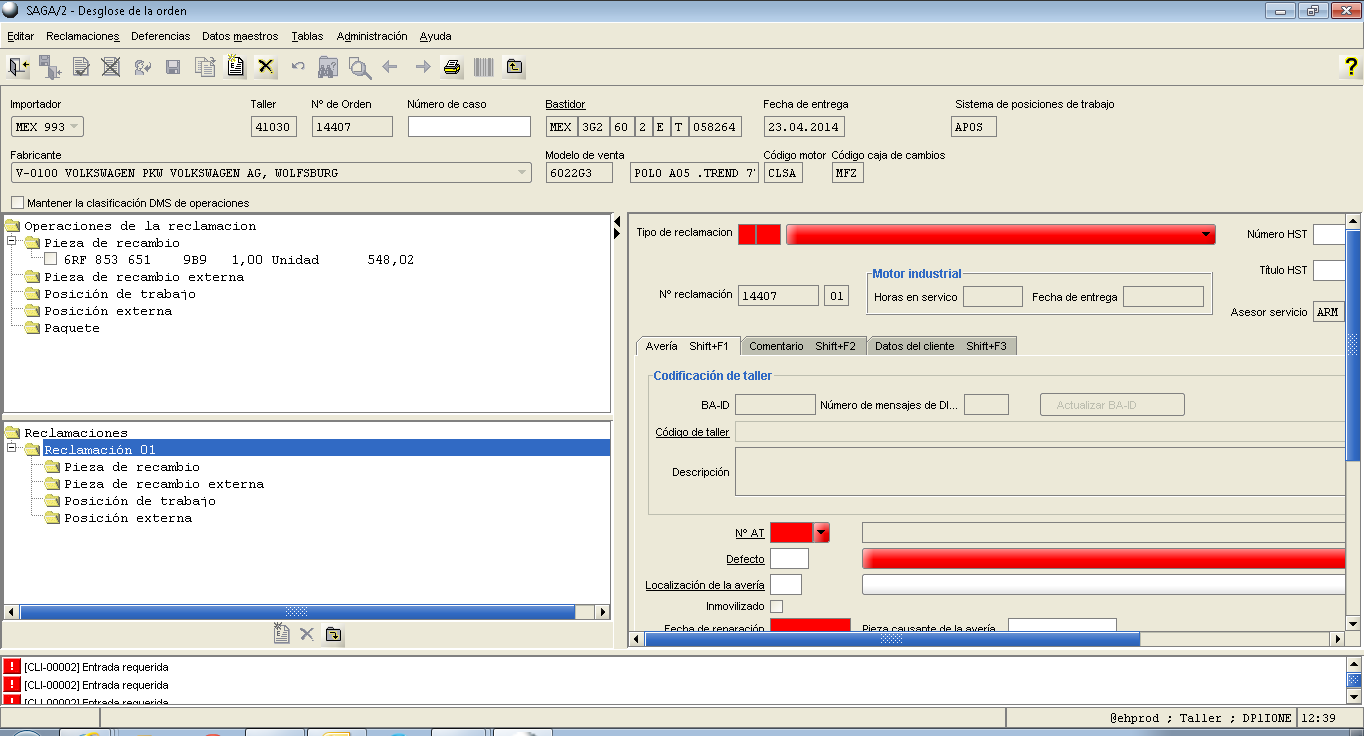 Cuando la orden se codifica en Reclamaciones, mostrará dentro de SAGA, los importes que pagará. Una vez completada el orden, cuando esta se encuentre en el estado de “A la espera de Facturación por parte del DMS” se Importarán averías desde W32.