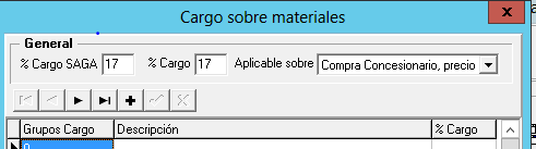 Con esto se configura el cargo adicional que se debe hacer en Refacciones cuando utilicemos la Interfaz y se importen las averías, este cargo se hará en el costo promedio que SAGA graba.