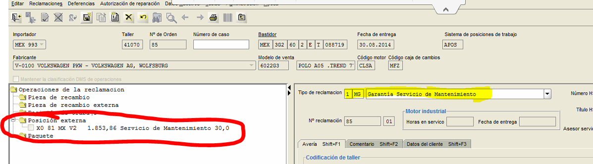 Cuando la reclamación este en SAGA con una única poscición de trabajo que se maneja como externa, el proceso que debe llevar es el normal. Se codifica, y se importan averias en W32.
