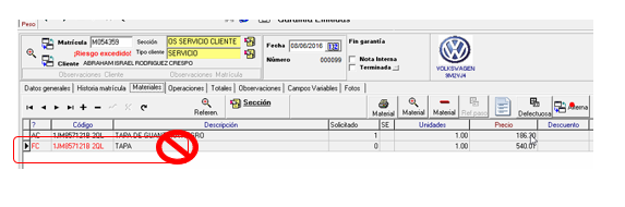 Debido a que es una cortesía al importar la avería a W32, el sistema crea una nueva línea con el mismo código de mano de obra o refacción (duplicando) para que se indique el pago que hará el cliente, en una factura para cliente indicando en la primera columna las siglas FC (factura cliente). Sin embargo, se deberán eliminar todas esas líneas que aparecen en color ROJO, tanto en Mano de obra como en Refacciones. Dado que la Orden del cliente ya fue creada previamente.