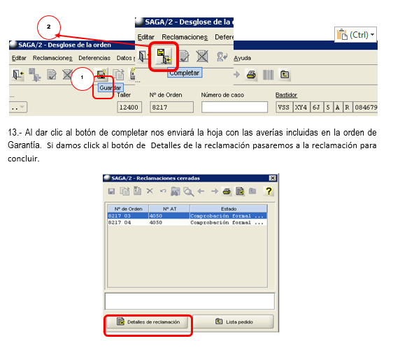 13.- Al dar clic al botón de completar nos enviará la hoja con las averías incluidas en la orden de Garantía. Si damos click al botón de Detalles de la reclamación pasaremos a la reclamación para concluir.