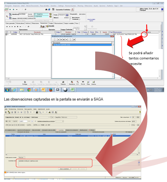 4.- Si necesita grabar Observaciones/Comentarios para que estos sean traspasados a SAGA, deberá realizarse en la (s) Operaciones, de la siguiente manera: