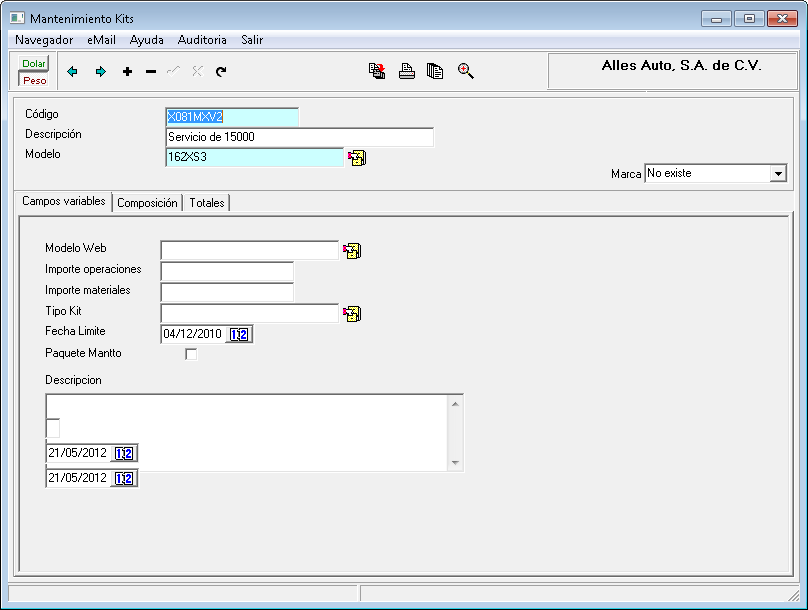 Se deberá crear el kit de servicio con el codigo que se enviará a SAGA, por ejemplo este kit tiene codigo X081MXVZ, se debe componer con sus operaciones y refacciones autorizadas.