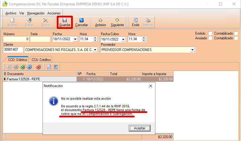 En caso de que el usuario seleccione un documento cuya forma de cobro sea distinta a 17 Compensación o 13 Pago por Subrogación, el sistema no permitirá Guardar la Compensación No Fiscal.