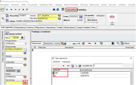 En el caso de una Orden tipo Garantía, el sistema mostrará en el campo “Tipo de Hoja” solo 2 valores: CMP y G