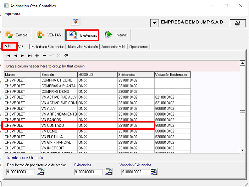 La asignación contable la tomará de las cuentas que se tengan configuradas en los Cargos de la Compra de VN y la cuenta de Inventario: