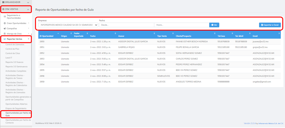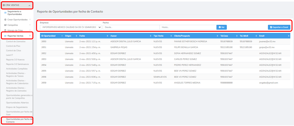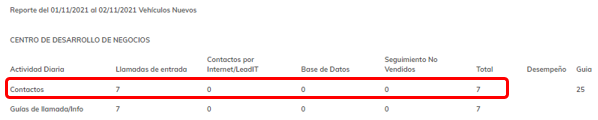 Se muestran los registros de Llamadas que se contactaron en un rango de fechas indicado. El resultado se puede Exportar a Excel y servirá para corroborar a detalle la información del Reporte 3.0 Nuevos y Seminuevos en el rubro “Contactos”: