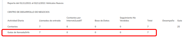 Se muestran los registros de Guías de Llamada que se crearon en un rango de fechas indicado. El resultado se puede Exportar a Excel y servirá para corroborar a detalle la información del Reporte 3.0 Nuevos y Seminuevos en el rubro “Guías de llamada/Info”:
